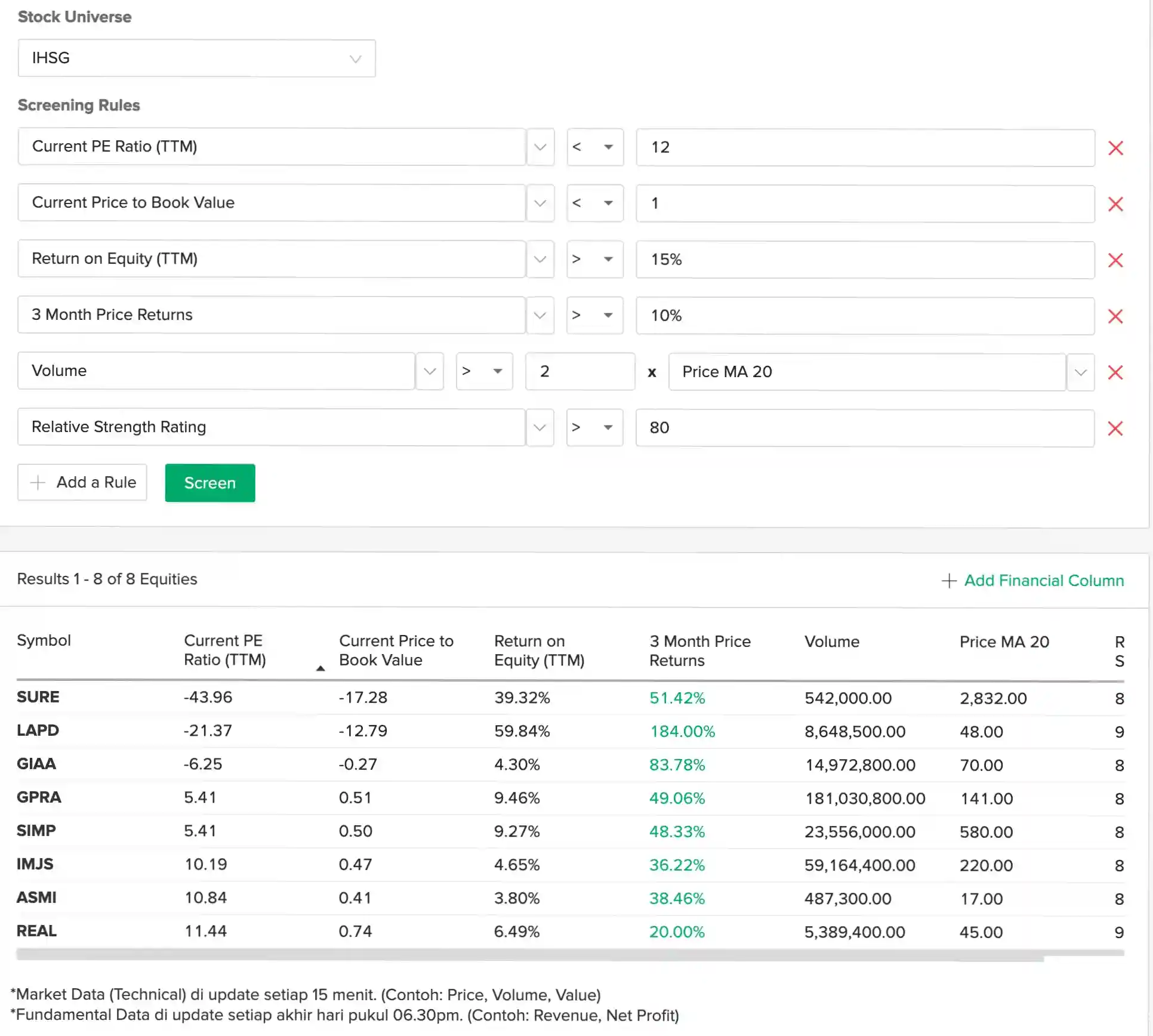 Bayangkan kamu menjalankan screener dengan parameter: PER < 12, PBV < 1, ROE ≥ 15 %, return 3 bulan > 10 %, volume > 2 × MA20, dan Relative Strength Rating ≥ 80. Setelah hasil ditampilkan, kamu mendapati dua kelompok saham dengan karakter berbeda. Kelompok pertama berisi saham dengan valuasi negatif namun kenaikan harga ekstrem. Kelompok kedua berisi saham undervalued secara tradisional, dengan profitabilitas sedang dan momentum teknikal kuat.